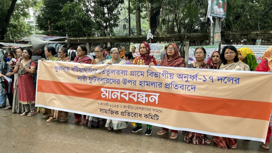 খুলনায় বটিয়াঘাটার তেঁতুলতলা গ্রামে বিভাগীয় অনূর্ধ্ব-১৭ দলের নারী ফুটবলারদের ওপর হামলার প্রতিবাদে সামাজিক প্রতিরোধ কমিটির উদ্যোগে মানববন্ধন অনুষ্ঠিত হয়েছে।