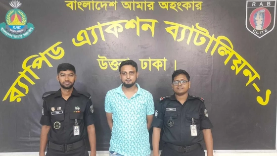 মঙ্গলবার (১২ নভেম্বর) রাত ১টা ৩০ মিনিটের দিকে রাজধানীর বসুন্ধরা আবাসিক এলাকা থেকে তাকে গ্রেপ্তার করা হয়।