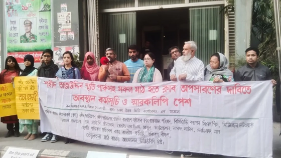 কর্মসূচি থেকে বক্তারা বলেন, শহীদ তাজউদ্দীন আহমেদ স্মৃতি মাঠ ও পার্ক গুলশান ইয়ুথ ক্লাবের দখল থেকে মুক্ত ও রক্ষা করা হোক। শহীদ তাজউদ্দীন আহমেদের নামে গুলশানে ১০৯ নম্বর রোডের মাঠ ও পার্কের নামকরণ করে সরকার। এ মাঠ ও পার্কটি সর্বস্তরের মানুষের জন্য উন্মুক্ত ছিল। বর্তমানে গুলশান ইয়ুথ ক্লাবের নামে কতিপয় ব্যক্তি মাঠ ও পার্কটি দখল করে রেখেছে। তারা ডিটেইল এরিয়া প্ল্যান, মাঠ, পার্ক জলাধার আইন, পরিবেশ আইন লঙ্ঘন করে অবকাঠামো তৈরি করছে। মাঠে ও পার্কে উন্মুক্ত জায়গা নেট দিয়ে ঘেরাও করেছে। শিশু ও সাধারণ মানুষদের ঢুকতে দেওয়া হয় না। মাঠটি বিভিন্ন প্রতিষ্ঠানের কাছে ভাড়া দিচ্ছে, ফলে সাধারণ মানুষ খেলাধুলা করতে পারছে না।