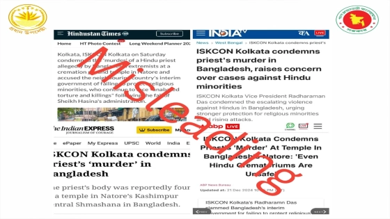 নাটোরে শ্মশান ঘাটের একটি ভোগঘরে সম্ভাব্য চুরির ঘটনায় এক ব্যক্তি নিহত হন। এক্ষেত্রে নিহত ব্যক্তি সনাতন ধর্মাবলম্বী হওয়ায় কোনো ধরনের যাচাই-বাছাই ছাড়াই পিটিআইসহ কিছু ভারতীয় গণমাধ্যম ঘটনাটিকে সাম্প্রদায়িক সহিংসতা হিসেবে প্রচার করছে বলে জানিয়েছে প্রধান উপদেষ্টার প্রেস উইং।