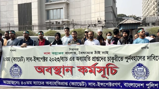 বাংলাদেশ পুলিশের ৪০তম ক্যাডেট সাব-ইন্সপেক্টর ব্যাচ থেকে অব্যাহতিপ্রাপ্তরা চাকরিতে পুনর্বহালের দাবিতে অবস্থান কর্মসূচি পালন করছে। রোববার (০৫ জানুয়ারি) রাজধানীর জিরো পয়েন্ট এলাকায় এ অবস্থান কর্মসূচি পালন করেন তারা।