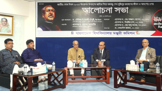 জাতীয় শোক দিবস উদযাপন উপলক্ষে জাতির পিতা বঙ্গবন্ধু শেখ মুজিবুর রহমানের জীবন ও আদর্শের ওপর এক আলোচনা সভায় মুখ্য আলোচক হিসেবে দেওয়া বক্তব্যে তিনি এ আহ্বান জানান। ইউজিসি অফিসার্স অ্যাসোসিয়েশন ও কর্মচারী ইউনিয়নের যৌথ উদ্যোগে রোববার ইউজিসি অডিটোরিয়ামে এই অনুষ্ঠান আয়োজন করা হয়।