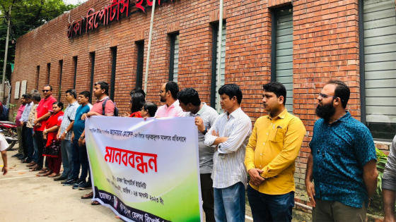 বৃহস্পতিবার (২৪ আগস্ট) দুপুরে ঢাকা রিপোর্টার্স ইউনিটির সামনে মানবন্ধনে এ দাবি জানান।