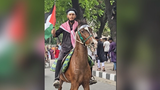 শনিবার (১২ এপ্রিল) এক যুবককে ঢাকা বিশ্ববিদ্যালয়ের টিএসসি এলাকায় ঘোড়া ছোটাতে দেখা যায়। তার হাতে ছিল ফিলিস্তিনের পতাকা। তাকে ঘিরে অনেকেই ফিলিস্তিনের পক্ষে মিছিল করতে থাকেন।