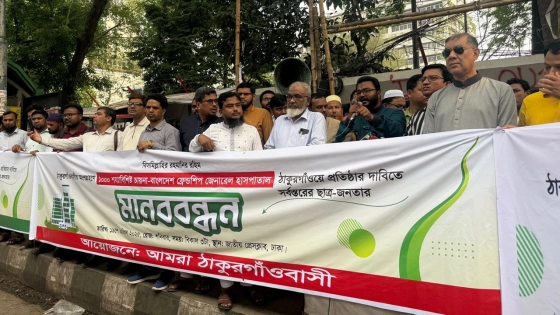 ‘আমরা ঠাকুরগাঁওবাসী’ আয়োজিত মানববন্ধনে এসব কথা বলেন বক্তারা। চায়না-বাংলাদেশ ফ্রেন্ডশিপ জেনারেল হাসপাতাল ঠাকুরগাঁওয়ে স্থাপনের দাবিতে শনিবার (১৯ এপ্রিল) বিকেলে জাতীয় প্রেস ক্লাবের সামনে এই মানববন্ধন হয়। এতে ঠাকুরগাঁও উন্নয়ন ফোরামসহ ঢাকাস্থ ঠাকুরগাঁওবাসীর বিভিন্ন সংগঠন অংশগ্রহণ করেন।