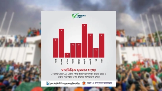 আওয়ামী সরকারের পতনের পর গত ৯ মাসে কমপক্ষে ৩৬টি হামলার ঘটনা ঘটেছে জুলাই আন্দোলনের সঙ্গে জড়িত ব্যক্তি ও তাদের পরিবারের সদস্যদের ওপর। এ নিয়ে প্রেস ইনস্টিটিউট বাংলাদেশের (পিআইবি) ফ্যাক্টচেক, মিডিয়া গবেষণা ও বিশ্লেষণী উইং ‘বাংলাফ্যাক্ট’ পরিচালিত এক গবেষণায় এ তথ্য উঠে এসেছে।