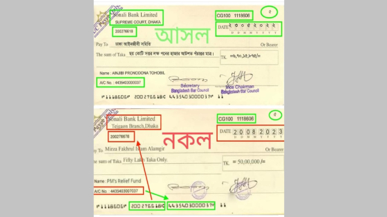 পাঁচ. সর্বোপরি, কোনো ইমেজকে ভুয়া বলে মনে হলে এর সোর্সিং করা জরুরি। আমাদের ফ্যাক্টচেকাররা এই চেকের ছবিকে সোর্সিং করতে পেরেছে অনলাইনে। এটি আদতে ছিল আইনজীবী প্রণোদনা তহবিল থেকে সুপ্রিম কোর্ট আইনজীবী সমিতিকে দেওয়া একটি অর্থসহায়তার চেক। চেকের গায়ে থাকা অ্যাকাউন্ট নম্বর রাউটিং নম্বর ইত্যাদির সঙ্গে ভাইরাল চেকের নম্বরগুলো মিলে যায়। এমনকি চেকদাতার স্বাক্ষরগুলোও হুবহু মিলে যায়। ছয়. গুজবের কফিনে শেষ পেরেক: মির্জা ফখরুল নিজেই সংবাদমাধ্যমকে দেওয়া সাক্ষাৎকারে এ রকম সহায়তা নেওয়ার কথা অস্বীকার করেছেন।