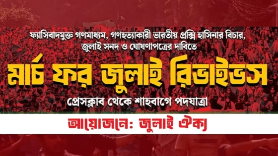 ফ্যাসিবাদমুক্ত গণমাধ্যম, শেখ হাসিনার বিচার, জুলাই সনদ ও ঘোষণাপত্রের দাবিতে ‘মার্চ ফর জুলাই রিভাইভস’ (প্রেসক্লাব থেকে শাহবাগে পদযাত্রা) কর্মসূচি পালন করবে গণ-অভ্যুত্থানের স্প্রিট ধারণ করা ঐক্যবদ্ধ প্লাটফর্ম জুলাই ঐক্য।