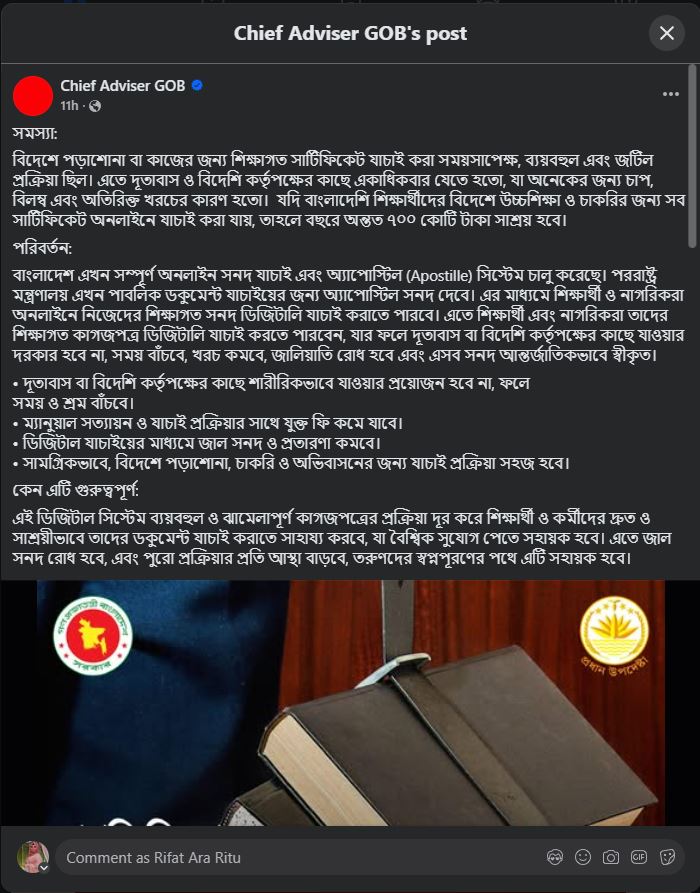 পোস্টে বলা হয়, বাংলাদেশ এখন সম্পূর্ণ অনলাইন সনদ যাচাই এবং অ্যাপোস্টিল (Apostille) সিস্টেম চালু করেছে। পররাষ্ট্র মন্ত্রণালয় এখন পাবলিক ডকুমেন্ট যাচাইয়ের জন্য অ্যাপোস্টিল সনদ দেবে। এর মাধ্যমে শিক্ষার্থী ও নাগরিকরা অনলাইনে নিজেদের শিক্ষাগত সনদ ডিজিটালি যাচাই করাতে পারবে। এতে শিক্ষার্থী ও নাগরিকরা তাদের শিক্ষাগত কাগজপত্র ডিজিটালি যাচাই করতে পারবেন, যার ফলে দূতাবাস বা বিদেশি কর্তৃপক্ষের কাছে যাওয়ার দরকার হবে না, সময় বাঁচবে, খরচ কমবে, জালিয়াতি রোধ হবে এবং এসব সনদ আন্তর্জাতিকভাবে স্বীকৃত।