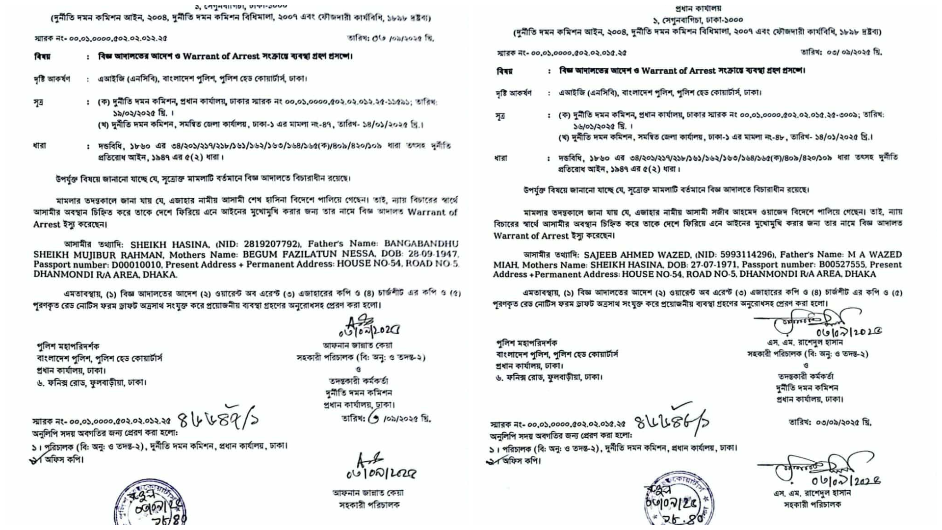 পৃথক দুটি চিঠিতে বলা হয়েছে, শেখ হাসিনা ও সজীব ওয়াজেদ জয় বিদেশে পালিয়ে গেছেন। তাই, ন্যায় বিচারের স্বার্থে আসামীর অবস্থান চিহ্নিত করে তাকে দেশে ফিরিয়ে এনে আইনের মুখোমুখি করার জন্য তাদের নামে বিজ্ঞ আদালত অ্যারেস্ট ওয়ারেন্ট ইস্যু করেছেন।