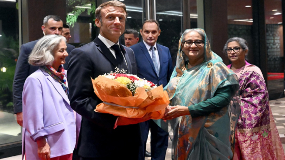 প্রধানমন্ত্রীর প্রেস উইং থেকে এসব তথ্য জানানো হয়। সেখানে ইমানুয়েল মাখোঁকে ফুল দিয়ে স্বাগত জানান প্রধানমন্ত্রী শেখ হাসিনা।