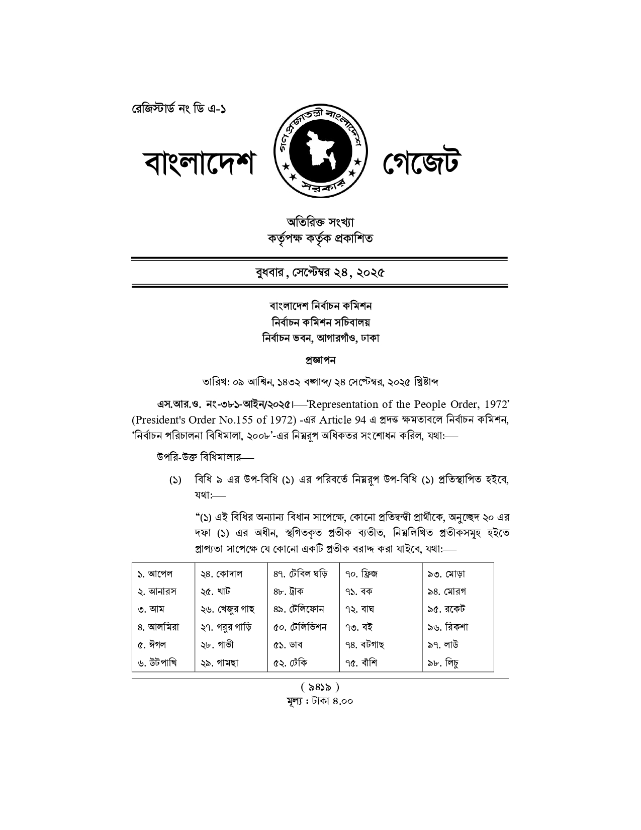 প্রজ্ঞাপনে বলা হয়, রিপ্রেজেন্টেশন অব দ্য পিপল অর্ডার, ১৯৭২ (প্রেসিডেন্স অর্ডার নং ১৫৫ অব ১৯৭২)-এর আর্টিকেল ৯৪-এ প্রদত্ত ক্ষমতাবলে নির্বাচন পরিচালনা বিধিমালা, ২০০৮-এ এই সংশোধনী এনেছে নির্বাচন কমিশন।