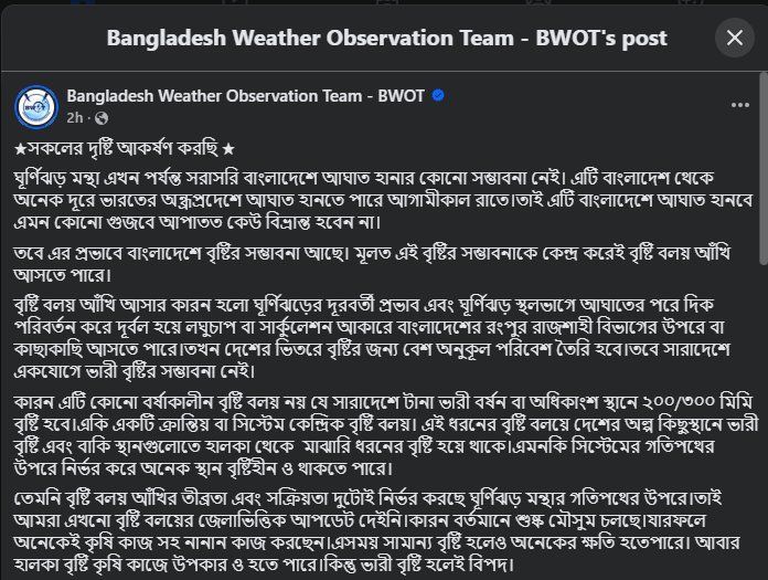 পোস্টে আরও বলা হয়, তেমনি বৃষ্টিবলয় আঁখির তীব্রতা এবং সক্রিয়তা দুটোই নির্ভর করছে ঘূর্ণিঝড় মোন্থার গতিপথের ওপরে। তাই আমরা এখনও বৃষ্টি বলয়ের জেলাভিত্তিক আপডেট দেইনি। কারণ বর্তমানে শুষ্ক মৌসুম চলছে। যার ফলে অনেকেই কৃষিকাজসহ নানান কাজ করছেন। এ সময় সামান্য বৃষ্টি হলেও অনেকের ক্ষতি হতে পারে। আবার হালকা বৃষ্টি কৃষি কাজে উপকার ও হতে পারে। কিন্তু ভারি বৃষ্টি হলেই বিপদ।