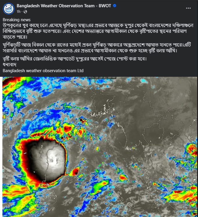 পোস্টে বলা হয়, ঘূর্ণিঝড়ের প্রভাবে আজ দুপুর থেকেই বাংলাদেশের দক্ষিণাঞ্চলে বিক্ষিপ্তভাবে বৃষ্টি শুরু হতে পারে এবং বুধবার (২৯ অক্টোবর) থেকে সারা দেশে বৃষ্টিপাতের পরিমাণ বাড়তে পারে। ঘূর্ণিঝড়টি সরাসরি বাংলাদেশে আঘাত না হানলেও এর প্রভাবে বুধবার (২৯ অক্টোবর) থেকে বৃষ্টিবলয় আঁখি শুরু হবে।