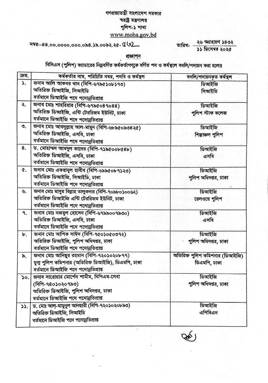 বৃহস্পতিবার (১১ ডিসেম্বর) স্বরাষ্ট্র মন্ত্রণালয়ের জারি করা প্রজ্ঞাপনে তাদের ডিএমপি, পুলিশ সদরদপ্তর, হাইওয়ে পুলিশ, এসবি, সিআইডিসহ বিভিন্ন ইউনিটে পদায়নের আদেশ দেওয়া হয়।