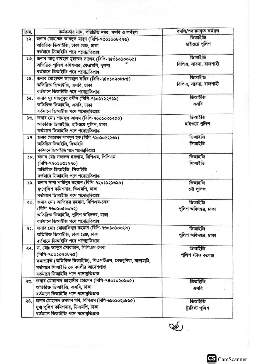 এর আগে, ২৬ নভেম্বর মোট ৩৩ জন পুলিশ কর্মকর্তা ডিআইজি পদে পদোন্নতি পান। তাদের মধ্যে ডিআইজি জাহিদুল হাসানকে খুলনা মেট্রোপলিটন পুলিশের (কেএমপি) নতুন কমিশনার হিসেবে দায়িত্ব দেওয়া হয়েছে। বাকিদের মধ্যে ৩০ জনকে নিয়মিতভাবে বিভিন্ন ইউনিটে পদায়ন করা হয়েছে। আর সুপারনিউমারারি পদোন্নতি পাওয়া দুই কর্মকর্তাকে অতিরিক্ত ডিআইজি হিসেবে দায়িত্ব দেওয়া হয়েছে।