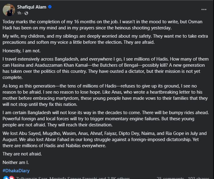 পোস্টে শফিকুল আলম লিখেছেন, ‘আজ আমার এ দায়িত্বের ১৬ মাস পূর্ণ হলো। লেখার মতো মানসিক অবস্থায় ছিলাম না। কিন্তু গতকালের নৃশংস গুলিবর্ষণের পর থেকে ওসমান হাদি আমার ভাবনায়, আমার দোয়ায়।’