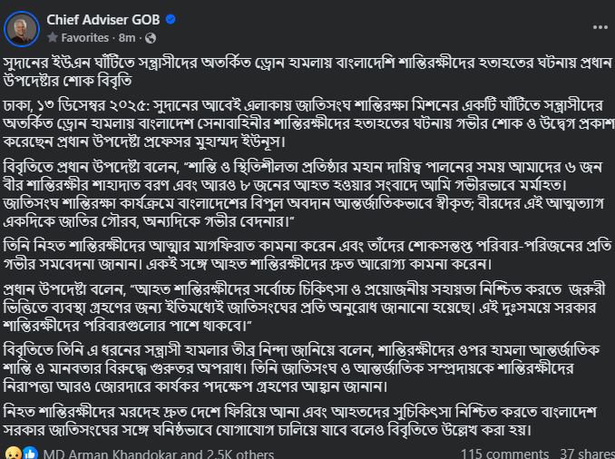 বিবৃতিতে ড. মুহাম্মদ ইউনূস বলেন, ‘শান্তি ও স্থিতিশীলতা প্রতিষ্ঠার মহান দায়িত্ব পালনের সময় আমাদের ৬ জন বীর শান্তিরক্ষীর শাহাদাত বরণ এবং আরও ৮ জনের আহত হওয়ার সংবাদে আমি গভীরভাবে মর্মাহত। জাতিসংঘ শান্তিরক্ষা কার্যক্রমে বাংলাদেশের বিপুল অবদান আন্তর্জাতিকভাবে স্বীকৃত; বীরদের এই আত্মত্যাগ একদিকে জাতির গৌরব, অন্যদিকে গভীর বেদনার।’