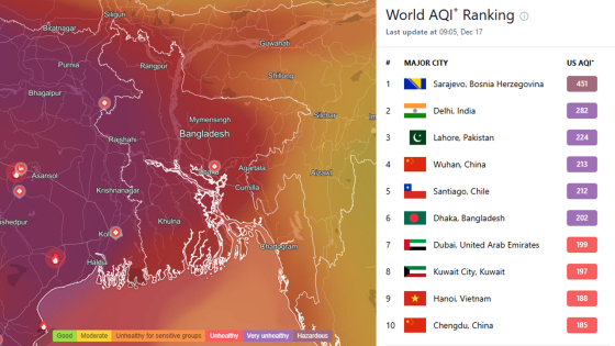 বুধবার (১৭ ডিসেম্বর) সকাল ৯টা ৫ মিনিটের দিকে আন্তর্জাতিক বায়ুমান প্রযুক্তি প্রতিষ্ঠান আইকিউএয়ারের তথ্যানুযায়ী, ২০২ স্কোর নিয়ে বিশ্বের দূষিত শহরের তালিকায় ষষ্ঠ অবস্থানে রয়েছে রাজধানী ঢাকা। বায়ুমানের এ স্কোর ‘খুব অস্বাস্থ্যকর’ হিসেবে গণ্য করা হয়।