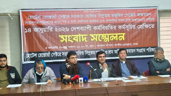 বিভিন্ন দাবিতে ১৪ জানুয়ারি থেকে কর্মবিরতির ঘোষণা দিয়েছে হোটেল-রেস্তোরাঁ সেক্টরের ন্যূনতম মজুরি ও শ্রম আইন বাস্তবায়ন সংগ্রাম পরিষদ।