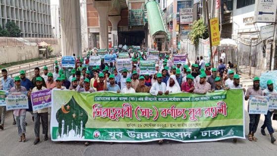 পবিত্র সিরাতুন্নবী (সা.) উপলক্ষে রাজধানীতে যুবউন্নয়ন সংসদের বর্ণাঢ্য র্যালি অনুষ্ঠিত হয়েছে। বৃহস্পতিবার (২৮ সেপ্টেম্বর) সকাল ১১টায় যুবউন্নয়ন সংসদ ঢাকার উদ্যোগে জাতীয় প্রেস ক্লাবের সামনে এ বর্ণাঢ্য র্যালি অনুষ্ঠিত হয়।
