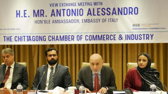 বুধবার (৪ অক্টোবর) চট্টগ্রাম চেম্বারের নেতাদের সঙ্গে এক মতবিনিময় সভায় এসব কথা বলেছেন বাংলাদেশে নিযুক্ত ইতালির রাষ্ট্রদূত আন্তোনিও আলেসান্দ্রো। চেম্বার ভবনের ওয়ার্ল্ড ট্রেড সেন্টারের বঙ্গবন্ধু কনফারেন্স হলে এই মতবিনিময় অনুষ্ঠান হয়েছে। এতে চেম্বার সভাপতি ওমর হাজ্জাজ সভাপতিত্ব করেছেন।