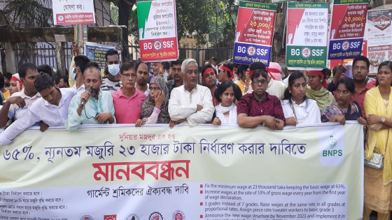 শ্রমিক সংগঠনের নেতারা, বিভিন্ন বেসরকারি উন্নয়ন সংস্থার কর্মীরা যৌথভাবে ৫ দফা দাবি তুলে গার্মেন্টস শ্রমিকদের ন্যূনতম মজুরি ২৩ হাজার টাকা নির্ধারণের দাবি জানিয়েছেন। শুক্রবার (১৩ অক্টোবর) রাজধানীর প্রেস ক্লাবের সামনে এক মানববন্ধন ও সমাবেশে এই দাবি উত্থাপন করা হয়।