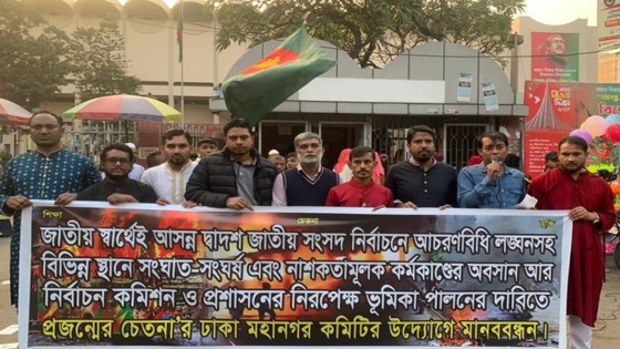 সংগঠনের ঢাকা মহানগর কমিটির আহ্বায়ক মো. ছালেক উর রহমান বলেন, ভোটের দিন যতই এগিয়ে আসছে নির্বাচনী অঙ্গনে হুমকি, ধমকি হিংসা-বিদ্বেষ ও সহিংস কর্মকাণ্ড বাড়ছে। প্রতিদিনই ক্ষতি হচ্ছে জান-মাল ও অর্থের। জাতীয় স্বার্থেই নাশকতা ও হিংসাত্মক কাজের সাথে জড়িত প্রকৃত ঘাতকদের চিহ্নিত ও শাস্তি নিশ্চিত করা সংশ্লিষ্ট কর্তৃপক্ষের নৈতিক দায়িত্ব। যারা নির্বাচনী মাঠে আচরণবিধি লঙ্ঘনসহ সংঘাত-সংঘর্ষ সৃষ্টি করছে, তাদের বিরুদ্ধে দল মতের ঊর্ধ্বে উঠে নির্বাচন কমিশন ও প্রশাসনকে কঠোর ব্যবস্থা গ্রহণ করতে হবে।