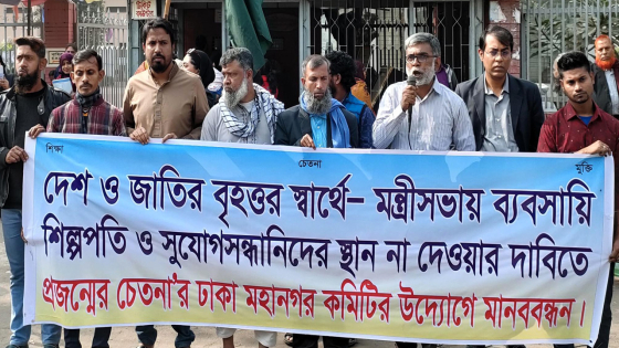 নতুন মন্ত্রিসভায় ব্যবসায়ী-শিল্পপতি ও সুযোগসন্ধানীদের স্থান না দেওয়ার দাবিতে মানববন্ধন করেছেন আত্মদায়বদ্ধ সামাজিক সংগঠন প্রজন্মের চেতনা। মঙ্গলবার (৯ জানুয়ারি) দুপুরে রাজধানীর শাহবাগের জাতীয় জাদুঘরের সামনে অনুষ্ঠিত মানববন্ধনে বক্তারা এ দাবি জানান।