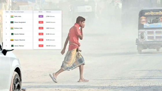 ভারতের দিল্লি, কলকাতা এবং পাকিস্তানের লাহোর যথাক্রমে ২৬১, ১৭৯ এবং ১৭১ একিউআই স্কোর নিয়ে তালিকার প্রথম, তৃতীয় এবং চতুর্থ স্থানে রয়েছে।