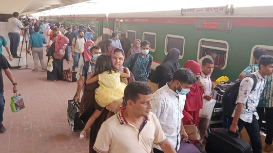 ঈদুল ফিতর উপলক্ষে রাজধানীর কমলাপুর রেলওয়ে স্টেশনে ঘরমুখো মানুষের ঈদযাত্রা শুরু হয়েছে। সপ্তাহজুড়ে অনলাইনে যারা ট্রেনের অগ্রিম টিকিট কাটতে পেরেছেন তারাই বাড়ির উদ্দেশে যাত্রা শুরু করেছেন আজ। আজ তারা কমলাপুর থেকে দেশের বিভিন্ন গন্তব্যে যাচ্ছেন।