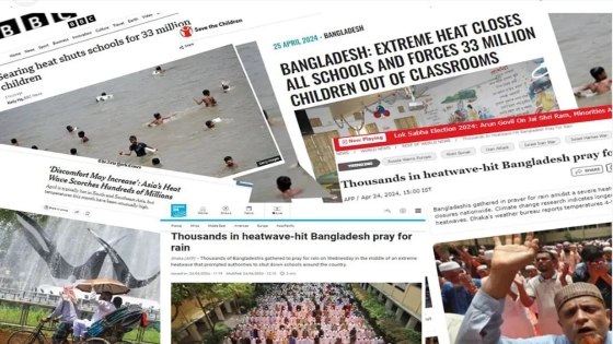 বাংলাদেশে চলছে স্মরণকালের দাবদাহ। থমকে আছে জনজীবন। বিষয়টি সংবাদ শিরোনাম হয়েছে আন্তর্জাতিক বিভিন্ন গণমাধ্যমে। সেখানে বলা হয়েছে, বাংলাদেশের বিভিন্ন অঞ্চলের ওপর দিয়ে তীব্র তাপপ্রবাহ বয়ে যাচ্ছে। কোনো কোনো এলাকার তাপমাত্রা ৪২ ডিগ্রি সেলসিয়াস ছাড়িয়েছে। এতে শিশুসহ সাধারণ মানুষ চরম ভোগান্তিতে রয়েছেন। স্কুল–কলেজ বন্ধ ঘোষণা করা হয়েছে। বৃষ্টির জন্য দেশের বিভিন্ন স্থানে নামাজের আয়োজন করা হয়েছে।