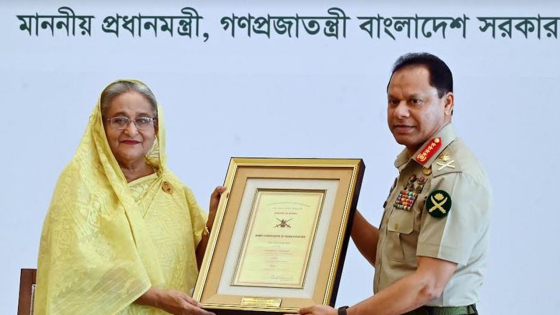 বাংলাদেশ সেনাবাহিনীকে দেশের স্বাধীনতা ও সার্বভৌমত্বের অতন্ত্র প্রহরী হিসেবে আখ্যায়িত করে- সরকারপ্রধান বলেন, বাংলাদেশ শান্তিতে বিশ্বাসী বলে কারও সঙ্গে যুদ্ধে জড়াতে চায় না। কারণ শান্তিপূর্ণ পরিবেশ উন্নয়নের পূর্বশর্ত।