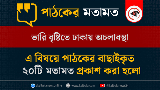 ভারি বৃষ্টিতে বৃহস্পতিবার (২১ সেপ্টেম্বর) রাতে ঢাকার সড়ক পানিতে তলিয়ে যায়। দেখা দেয় অচলাবস্থা। ঢাকার পানি নিষ্কাশন ব্যবস্থা নিয়ে কালবেলার ফেসবুক পেজে (Kalbela Online) পাঠকের মতামত থেকে বাছাইকৃত ২০টি মতামত প্রকাশ করা হলো।