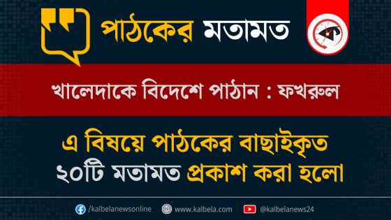 দৈনিক কালবেলার অনলাইন সংস্করণে ২৯ সেপ্টেম্বর (শুক্রবার) ‘পরিবারের আবেদনে খালেদা জিয়াকে বিদেশে পাঠান : সরকারকে ফখরুল’ শিরোনামে প্রকাশিত খবরের বিষয়ে কালবেলার ফেসবুক পেজে (Kalbela Online) পাঠকের মতামত থেকে বাছাইকৃত ২০টি মতামত প্রকাশ করা হলো।