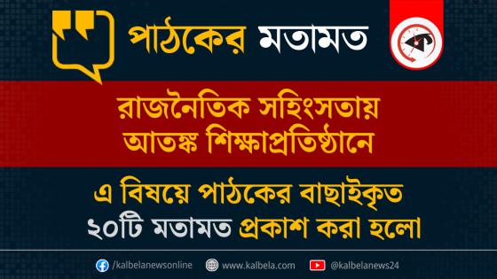দৈনিক কালবেলায় ৬ নভেম্বর (সোমবার) ‘রাজনৈতিক সহিংসতায় আতঙ্ক শিক্ষাপ্রতিষ্ঠানে’ শিরোনামে প্রকাশিত খবরের বিষয়ে কালবেলার ফেসবুক পেজে (Kalbela Online) পাঠকের মতামত থেকে বাছাইকৃত মতামত প্রকাশ করা হলো।