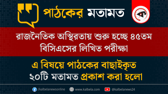 দৈনিক কালবেলায় ২১ নভেম্বর (মঙ্গলবার) ‘রাজনৈতিক অস্থিরতায় শুরু হচ্ছে ৪৫তম বিসিএসের লিখিত পরীক্ষা। ২৭ নভেম্বর থেকে অনুষ্ঠিতব্য এ পরীক্ষা পেছানোর দাবি করেছেন পরীক্ষার্থীরা।’ শিরোনামে প্রকাশিত খবরের বিষয়ে কালবেলার ফেসবুক পেজে (Kalbela Online) পাঠকের মতামত থেকে বাছাইকৃত মতামত প্রকাশ করা হলো।