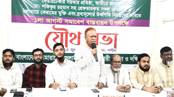 কেয়ারটেকার সরকার প্রতিষ্ঠা, আমিরে জামায়াত ডা. শফিকুর রহমানসহ জাতীয় নেতৃবৃন্দ ও ওলামায়ে কেরামের মুক্তি এবং দ্রব্যমূল্যের ঊর্ধ্বগতি নিয়ন্ত্রণের দাবিতে আগামী ১ আগস্ট জাতীয় মসজিদ বায়তুল মোকাররমের উত্তর গেটে শান্তিপূর্ণ সমাবেশ বাস্তবায়নের লক্ষ্যে আজ মঙ্গলবার দুপুরে রাজধানীর একটি মিলনায়তনে বাংলাদেশ জামায়াতে ইসলামী ঢাকা মহানগরী উত্তর ও দক্ষিণ শাখার সমন্বয় সভা অনুষ্ঠিত হয়।