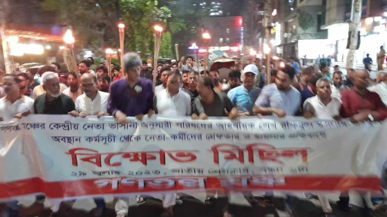 বিক্ষোভ সমাবেশের পর মঞ্চের নেতাকর্মীদের একটি প্রতিবাদী মশাল মিছিল তোপখানা রোড, বিজয়নগর হয়ে পল্টন মোড়ে এসে শেষ হয়।