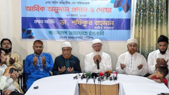 শনিবার (১৭ আগস্ট) বিকেলে বাংলাদেশ জামায়াতে ইসলামী ঢাকা মহানগরী দক্ষিণের উদ্যোগে বৈষম্যবিরোধী ছাত্র-জনতার গণঅভ্যুত্থানে শহীদ সাংবাদিক মেহেদী হাসান ও শহীদ জাহাঙ্গীরের পরিবারকে আর্থিক সহায়তা প্রদান ও দোয়া অনুষ্ঠানে প্রধান অতিথির বক্তব্যে এসব কথা বলেন জামায়াতের আমির।