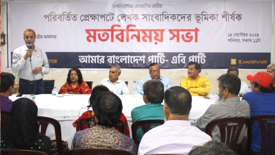 বিপ্লবের লক্ষ্য বাস্তবায়ন ও জাতীয় ঐক্য অটুট রাখতে লেখক-সাংবাদিকদের সৃষ্টিশীল দৃঢ় ভূমিকা রাখার আহ্বান জানিয়েছে আমার বাংলাদেশ (এবি) পার্টি। ছাত্র-জনতার গণঅভ্যুত্থান পরবর্তী পরিস্থিতিতে লেখক সাংবাদিকদের ভূমিকা শীর্ষক মতবিনিময় সভায় এ আহ্বান জানান এবি পার্টির সদস্যসচিব মজিবুর রহমান মঞ্জু।