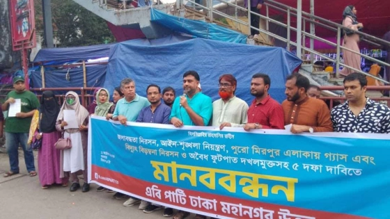 জলাবদ্ধতা নিরসন, আইনশৃঙ্খলা নিয়ন্ত্রণ ও অবৈধ ফুটপাত দখলমুক্ত এবং বৃহত্তর মিরপুরের বিদ্যুৎ ও গ্যাস সংকট নিরসনসহ ৫ দফা দাবিতে আমার বাংলাদেশ (এবি) পার্টি ঢাকা মহানগর উত্তরের মানববন্ধন কর্মসূচি পালিত হয়েছে।