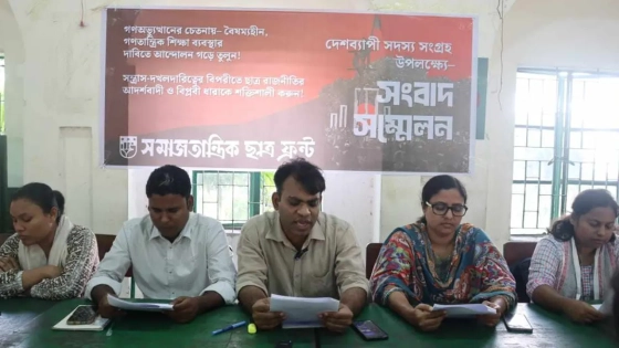 লিখিত বক্তব্যে বলা হয়, জাগ্রত ছাত্র সমাজের সংগ্রামের ধারাবাহিকতায়- ‘সর্বজনীন, বিজ্ঞানভিত্তিক সেক্যুলার, গণতান্ত্রিক, একই ধারার শিক্ষা’র স্লোগান নিয়ে ১৯৮৪ সালে ২১ জানুয়ারি সমাজতান্ত্রিক ছাত্র ফ্রন্ট প্রতিষ্ঠা লাভ করে। প্রতিষ্ঠালগ্ন থেকে এ সংগঠন ছাত্রদের সাথে নিয়ে সর্বজনীন, বিজ্ঞানভিত্তিক, সেক্যুলার, গণতান্ত্রিক, একই ধারার শিক্ষার দাবিতে আন্দোলন করে যাচ্ছে। বিগত সময়ে হাসিনা সরকার জ্ঞান-বিজ্ঞান-মনুষ্যত্ব ধ্বংসের জন্য জাতীয় শিক্ষাক্রম-২০২১ চালু করে। একমাত্র ছাত্র সংগঠন হিসেবে এটি বাতিলের দাবিতে আমরা সারাদেশে ছাত্র-শিক্ষক-অভিভাবক- বুদ্ধিজীবীদের সংগঠিত করি। আন্দোলনের এক পর্যায়ে অন্তবর্তীকালীন সরকার এটি বাতিলের ঘোষণা দেয়। অতীতে শিক্ষা প্রতিষ্ঠানগুলোতে সমাজতান্ত্রিক ছাত্র ফ্রন্ট ছাত্রস্বার্থ বিরোধী সমস্ত পদক্ষেপের বিরুদ্ধে সোচ্চার ছিলো, আজও আছে। শিক্ষার বেসরকারীকরণ-বাণিজ্যিকীকরণ-সংকোচন এবং সাম্প্রদায়িকীকরণের বিরুদ্ধে লড়াই, ছাত্র সংসদ নির্বাচন নিশ্চিত সহ গণতান্ত্রিক ক্যাম্পাস বিনির্মানের চেষ্টা, সাম্রাজ্যবাদী আগ্রাসন বিরোধী লড়াই, জাতীয় সম্পদ রক্ষা এবং শ্রমজীবী মানুষের অধিকার প্রতিষ্ঠাসহ বিভিন্ন গণতান্ত্রিক দাবিতে আমরা লড়ছি। এছাড়াও নারী নির্যাতন, সাম্প্রদায়িক নিপীড়ন এবং পাহাড়ি জনগোষ্ঠীর ওপর নির্যাতনের বিরুদ্ধে আমাদের লড়াই চলমান।