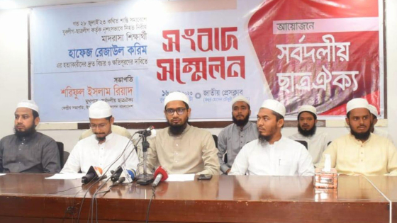 বুধবার (১৬ আগস্ট) সকালে রাজধানীর জাতীয় প্রেস ক্লাবের জহুর হোসেন চৌধুরী মিলনায়তনে এক সংবাদ সম্মেলনে এসব কথা বলা হয়। গত ২৮ জুলাই যুবলীগ-ছাত্রলীগের শান্তি সমাবেশে নৃশংসভাবে নিহত নিরীহ মাদ্রাসা শিক্ষার্থী হাফেজ রেজাউল করিমের হত্যাকারীদের দ্রুত বিচারের দাবিতে সর্বদলীয় ছাত্র ঐক্যের প্রধান সমন্বয়ক ও বাংলাদেশ খেলাফত ছাত্র মজলিসের কেন্দ্রীয় সভাপতি পরিষদের সদস্য মুহাম্মাদ কামাল উদ্দীনের সঞ্চালনায় আয়োজিত সংবাদ সম্মেলনে সর্বদলীয় ছাত্র ঐক্যের মুখপাত্র ও ইসলামী ছাত্র আন্দোলন বাংলাদেশের কেন্দ্রীয় সভাপতি শরিফুল ইসলাম রিয়াদ সাংবাদিকদের এসব কথা বলেন।