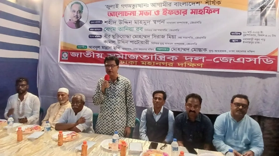 ঢাকা মহানগর দক্ষিণ জেএসডির আহ্বায়ক আবদুল মান্নান মুন্সির সভাপতিত্বে এবং যুগ্ম আহ্বায়ক মোহাম্মদ মোস্তাকের সঞ্চালনায় এতে আরো বক্তব্য রাখেন দলের সহসভাপতি বীর মুক্তিযোদ্ধা মোহাম্মদ সিরাজ মিয়া, সিনিয়র যুগ্ম সাধারণ সম্পাদক কামাল উদ্দিন পাটোয়ারী, যুগ্ম সাধারণ সম্পাদক অ্যাডভোকেট সৈয়দ বেলায়েত হোসেন বেলাল, মোশারেফ হোসেন, সাংগঠনিক সম্পাদক এসএম সামছুল আলম নিক্সন, দপ্তর সম্পাদক কামরুল আহসান অপু, মোহাম্মদ শামিম, ছাত্রনেতা মোসলেহ উদ্দিন বিজয় প্রমুখ।