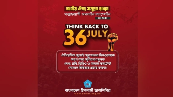 জাতীয় ঐক্য সমুন্নত রাখার লক্ষ্যে ২৪ থেকে ৩০ মে পর্যন্ত সপ্তাহব্যাপী অনলাইন ক্যাম্পেইন ‘Think Back To 36 July’ ঘোষণা করেছে বাংলাদেশ ইসলামী ছাত্রশিবির।