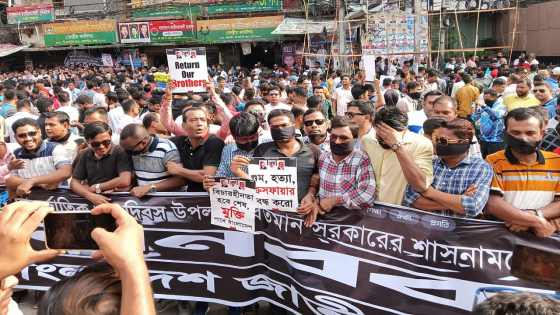 আন্তর্জাতিক গুম প্রতিরোধ দিবস উপলক্ষে মুখে কালো কাপড় বেঁধে মানববন্ধন করছেন বিএনপির নেতাকর্মীরা।