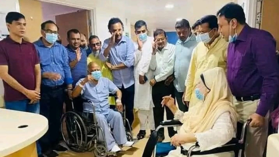 দলীয় প্রধান হাসপাতাল থেকে বাসায় যাচ্ছেন শুনে হুইল চেয়ারে করে বিদায় জানাতে আসেন মোশাররফ। ওই সময় দুজনের সাক্ষাৎ হয় হাসপাতালের লবিতে।