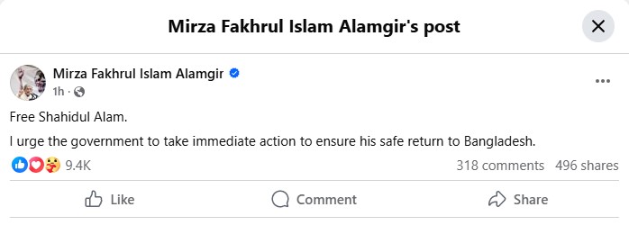 মির্জা ফখরুল লেখেন, ‘শহিদুল আলমকে মুক্ত করুন। আমি সরকারকে তার নিরাপদে বাংলাদেশে প্রত্যাবর্তন নিশ্চিত করার জন্য অবিলম্বে পদক্ষেপ নেওয়ার আহ্বান জানাচ্ছি।’