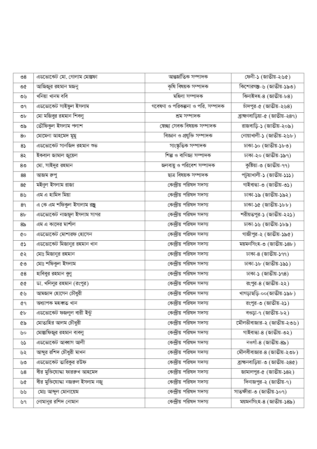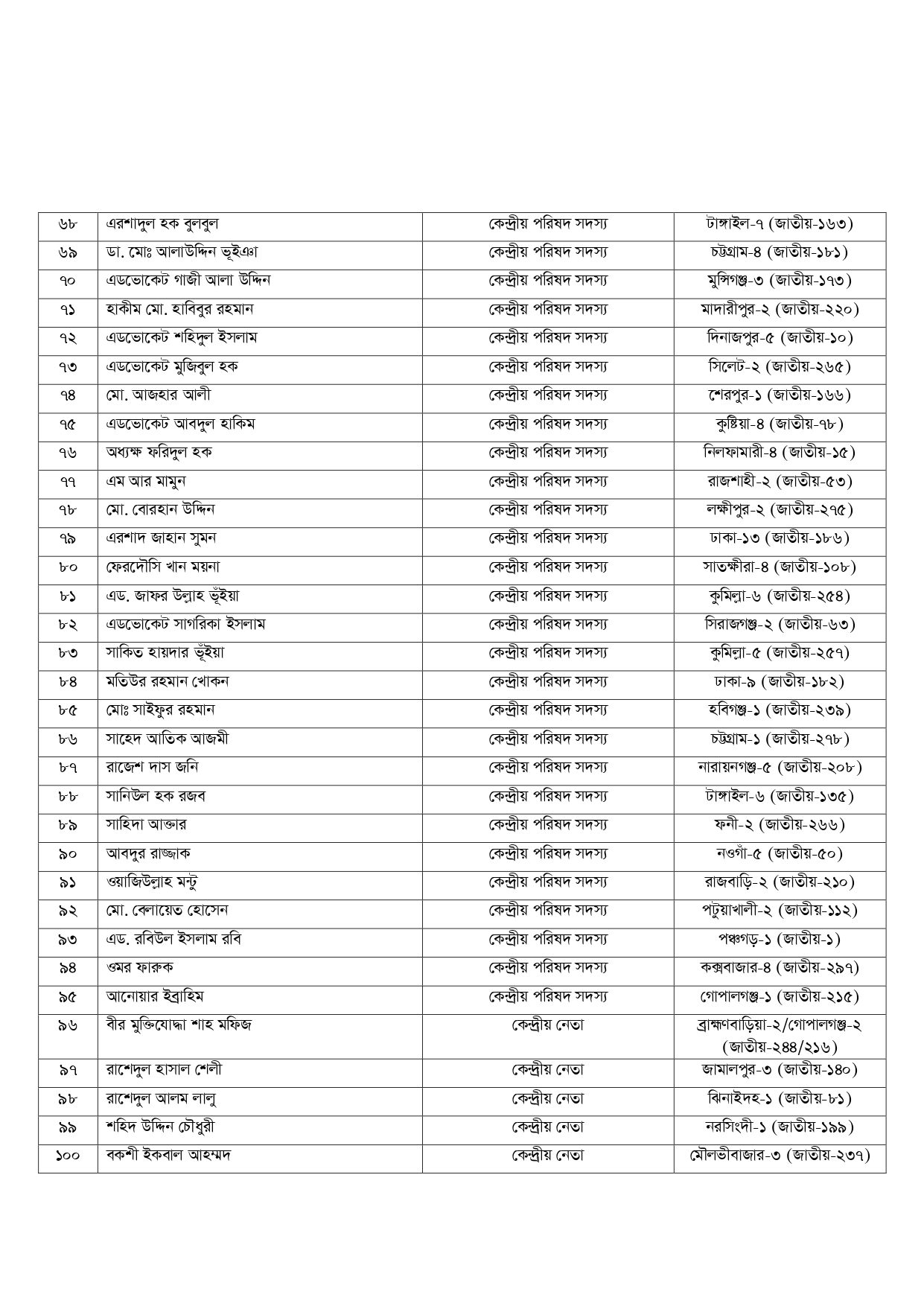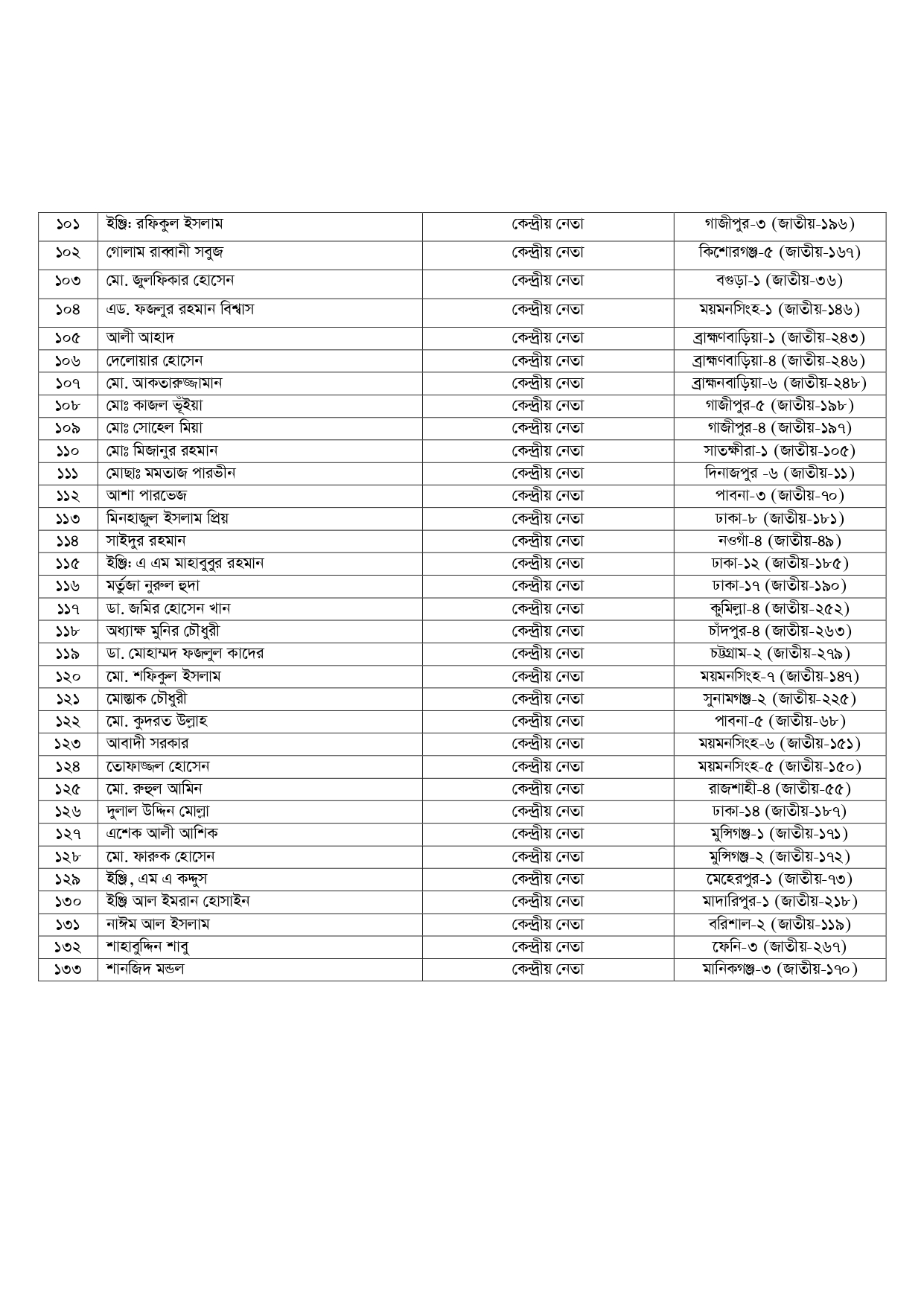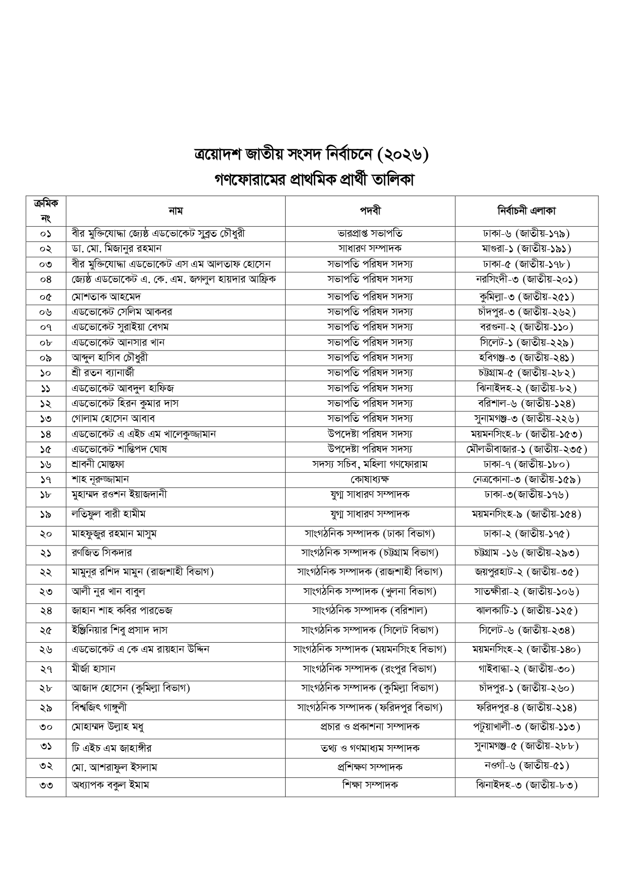 ঘোষিত তালিকা অনুযায়ী, দলের সভাপতি পরিষদের সদস্য অ্যাডভোকেট আলতাফ হোসেন ঢাকা-৫, অ্যাডভোকেট জগলুল হায়দার আফ্রিক নরসিংদী-৩, মোশতাক আহমেদ কুমিল্লা-৩, অ্যাডভোকেট সেলিম আকবর চাঁদপুর-৩, অ্যাডভোকেট সুরাইয়া বেগম বরগুনা-২, অ্যাডভোকেট আনসার খান সিলেট-১, আব্দুল হাসিব চৌধুরী হবিগঞ্জ-৩, রতন ব্যানার্জী চট্টগ্রাম-৫, অ্যাডভোকেট আবদুল হাফিজ ঝিনাইদহ-২, অ্যাডভোকেট হিরন কুমার দাস বরিশাল-৬, গোলাম হোসেন আবাব সুনামগঞ্জ-৩; উপদেষ্টা পরিষদের সদস্য অ্যাডভোকেট এএইচএম খালেকুজ্জামান ময়মনসিংহ-৮, অ্যাডভোকেট শান্তিপদ ঘোষ মৌলভীবাজার-১, প্রচার ও প্রকাশনা সম্পাদক মোহাম্মদ উল্লাহ মধু পটুয়াখালী-৩ আসন থেকে লড়বেন।
